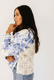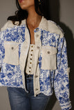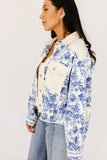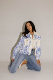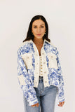 this vintage-inspired cropped jacket will solve any boring outfit crisis. lightweight + luxurious, it features a damask blue floral pattern + distressed lace patchwork panels. kinda oversized + kinda iconic, it’s perfect for layering over tanks + tees all season long.