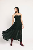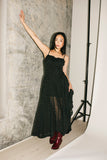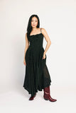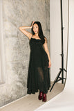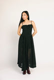 - black // square neckline, maxi length, basque waist, pockets, adjustable straps, front adjustable tie, elastic neckline, back zipper, lined to thigh