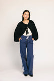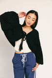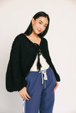 - black // v-neckline, open front, drop shoulder, balloon sleeves, cuffed, front tie