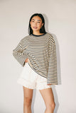 the throw on + go piece of our dreams, this long sleeve striped top will take you from day to night, season after season. with its slouchy, oversized fit + chic, sporty feel, it’s the perfect top for date nights, concerts, + casual outings.