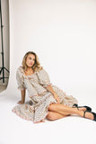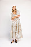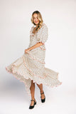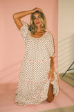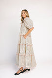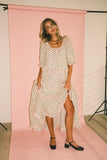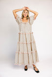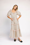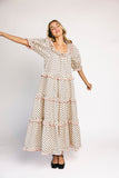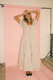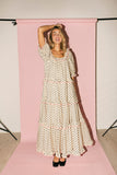 - polka dot + off white base // maxi length, lined, puff sleeve, tiered skirt, elastic scoop neckline, pockets, pink ruffle details