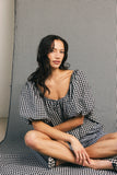 - black gingham // square neckline, puff sleeves, elastic cuffs, elastic neckline, tie detailing, lined