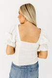 - oatmeal // soft v-neckline, front tie, puff sleeves, elastic cuffs, smocked in back, mixed fabric