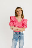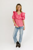 - pink // v-neckline, ruffle detailing, elastic cuffs
