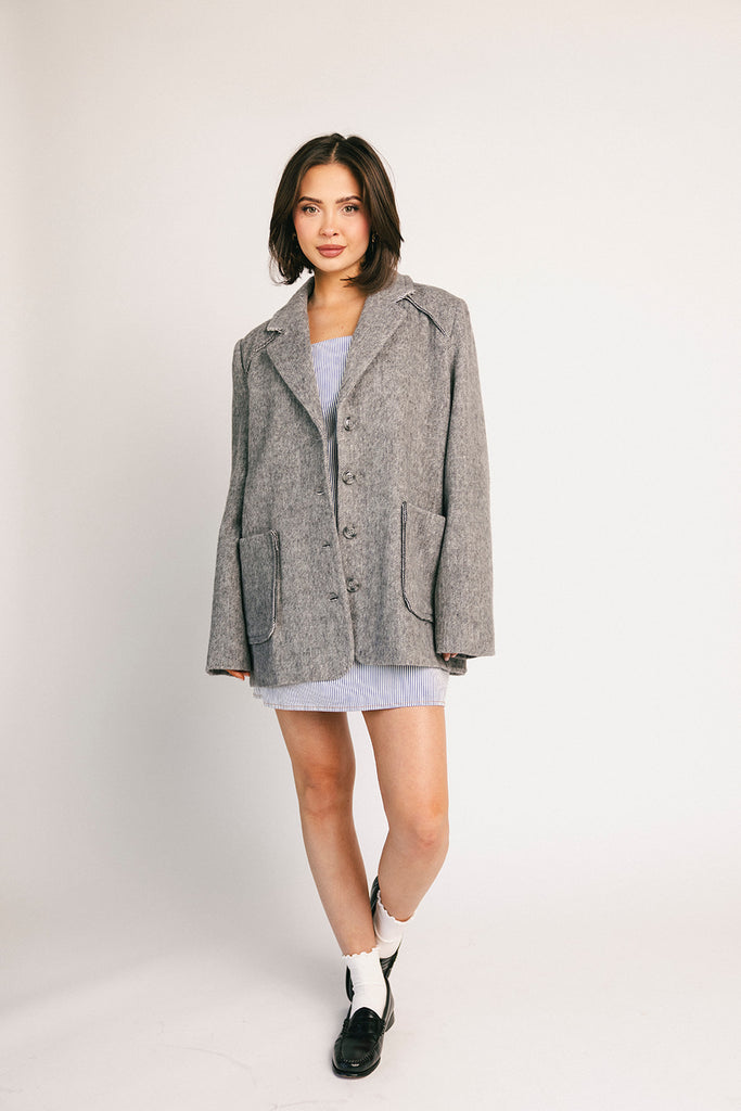 - heather grey // lapel collar, buttons, pockets, raw edges detailing, lined, back slit