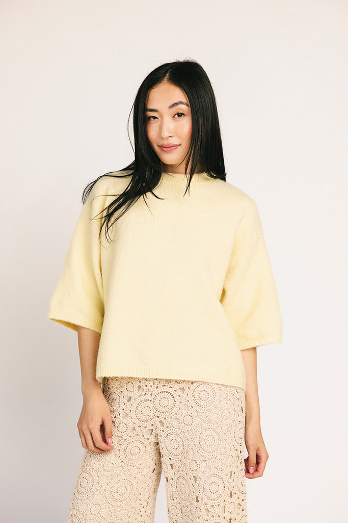 super comfy + extra chic, this yellow knit top is the perfect basic for every season. with its oversized t-shirt vibes + luxurious sweater feel, you can easily dress it up or down for any occasion. wear it as a layer over dresses + blouses, or style it solo with your favorite denim.