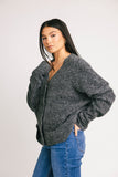 - charcoal // v-neckline, buttons, pockets, drop shoulder, ribbing at neckline hem, and cuffs