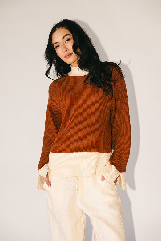 - rust // mock neck, two toned knit, split hem, split hem cuffs