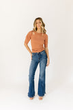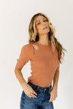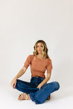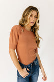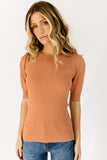 - salmon // high neckline, puff sleeves, keyhole opening, tie detail, ribbed