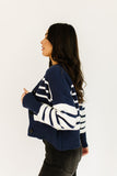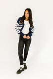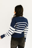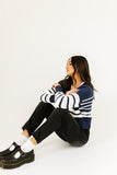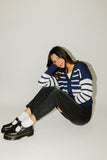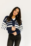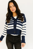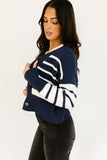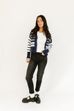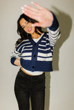 both trendy + timeless, this navy striped cardigan is perfect for layering up or styling solo. slightly cropped with a relaxed silhouette, you can dress it up with trousers + skirts, or down with jeans + cargos. a timeless piece you’ll have on rotation season after season.