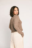 - mocha // scoop neckline, shell buttons, ruffle edges, hem + cuffs