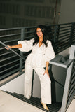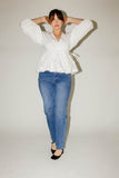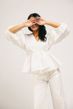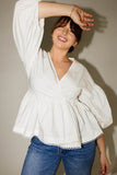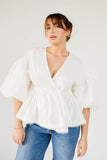 elevate any outfit with this stunning white puff sleeve blouse. featuring an effortless wrap silhouette with a peplum-style shape, it's a top that’s romantic enough for date night, comfortable enough for everyday wear, + timeless enough to keep in your closet forever. dress it up with a maxi skirt + heels, or down with denim + flats.