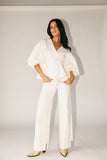 - white // v-neckline, true wrap, peplum, drop shoulder, adjustable tie side, inside button closure, 3/4 balloon sleeves, open scallop hem detail