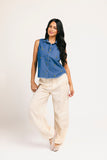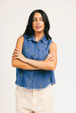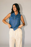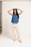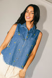 - denim // collared, buttons, unfinished rounded hem, front pockets, sunflower embroidery