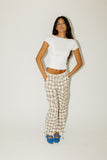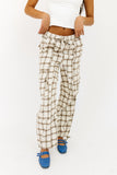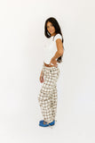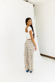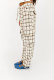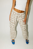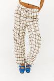 - taupe plaid // straight leg, elastic drawstring waistband, pockets, adjustable tie at hem