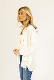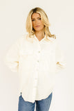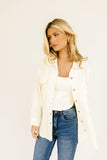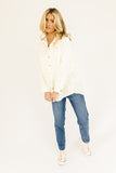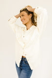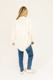 an off-white oversized button-up that’s full of spring outfit possibilities. with its relaxed fit + trendy raw hemline, it’s the perfect flowy oversized top to layer up or style solo. pair it with jeans + sneakers for casual date nights, or style it with a skirt for work lunches.