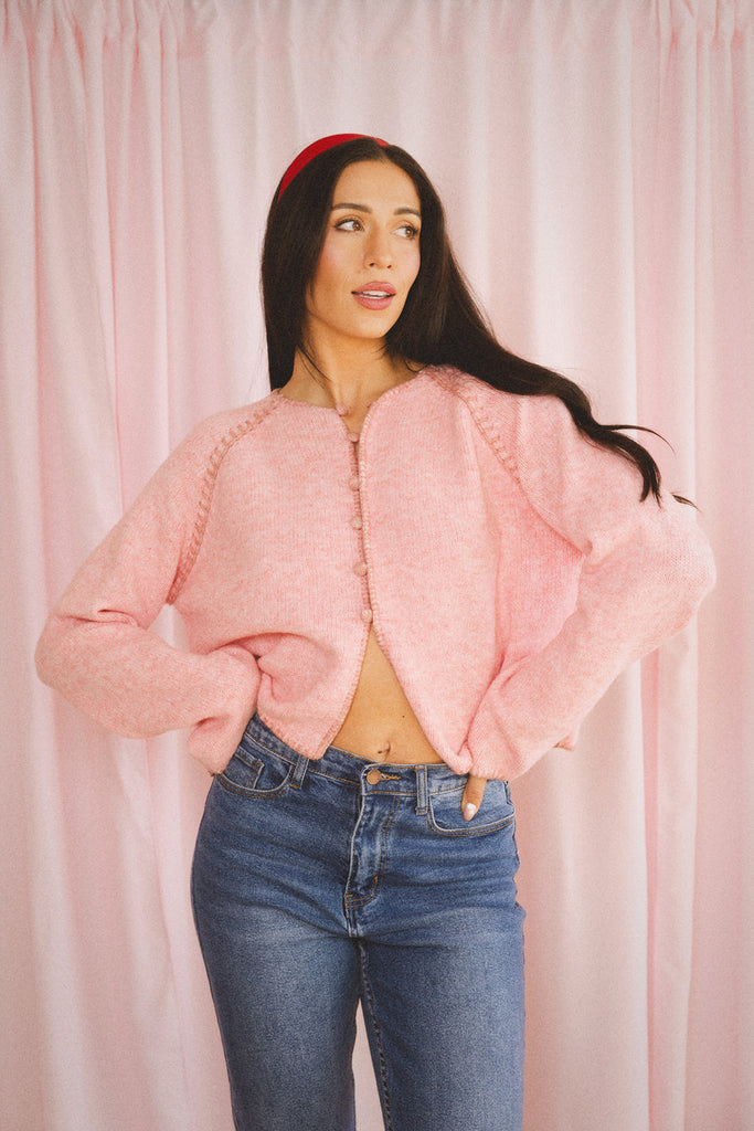 vintage charm, but make it spicy. this cropped pink cardigan has a relaxed fit, chic toggle buttons, + a flirty open front hem. the perfect all-season sweater to style with your favorite denim, or throw on over a flowy sundress.