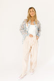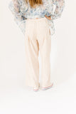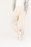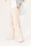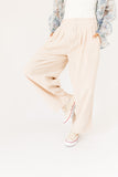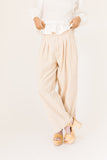 - beige // zip fly, hook closure, pleating at top, elastic waistband, pockets, belt loops