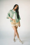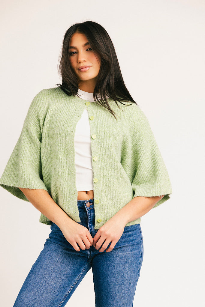 this zoco exclusive short-sleeve cardigan is soft, slouchy, + full of styling moments. with its relaxed, boxy fit + loose drop shoulders, it’s a cardi made for layering over tanks + dresses or styling solo with your favorite bottoms. the perfect light green button-up knit for every season + situation.